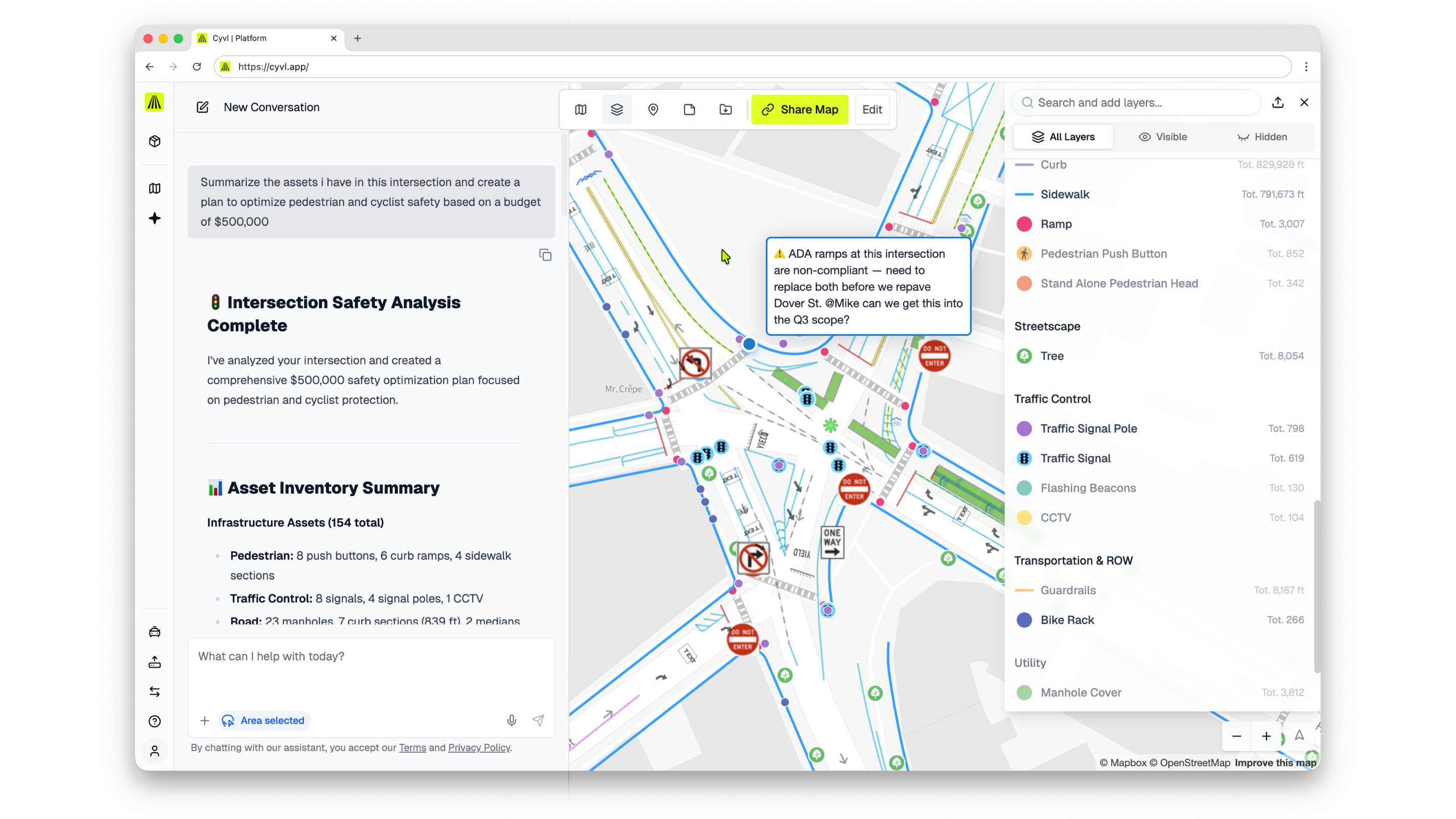 Cyvl's AI processes your raw data into a living, AI-enabled digital twin of your infrastructure. Every asset is inventoried, scored, and mapped — pavement conditions, ADA compliance gaps, sign retroreflectivity, and distresses down to the block level.
